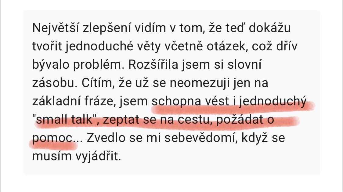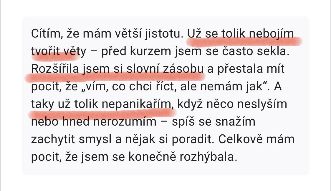 „Cítím větší jistotu. Už se tolik nebojím tvořit věty. Když něčemu nerozumím, nepanikařím. Zachytím smysl sdělení a poradím si.“
