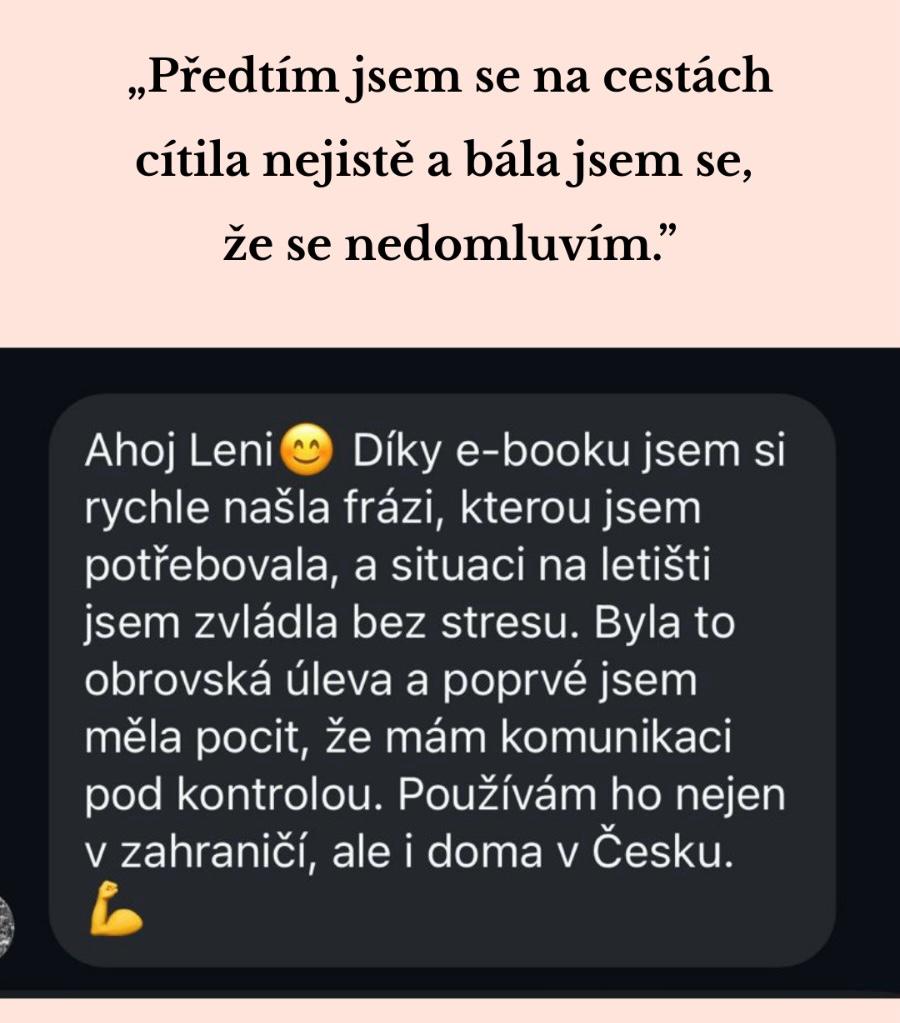 „Podle mě je úplně nejlepší věc si e-book vytisknout! Je jasný, přehledný a bez zbytečných vět. Oceňuju, že obsahuje slovíčka, fráze i quizletové sety s výslovností. Na rozdíl od klasických knih, kde se opakují pořád dokola stejná slova, tohle opravdu využiju v praxi.